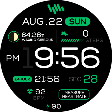 The WatchFace has a battery, a staps counter, and a heartrate measurement.